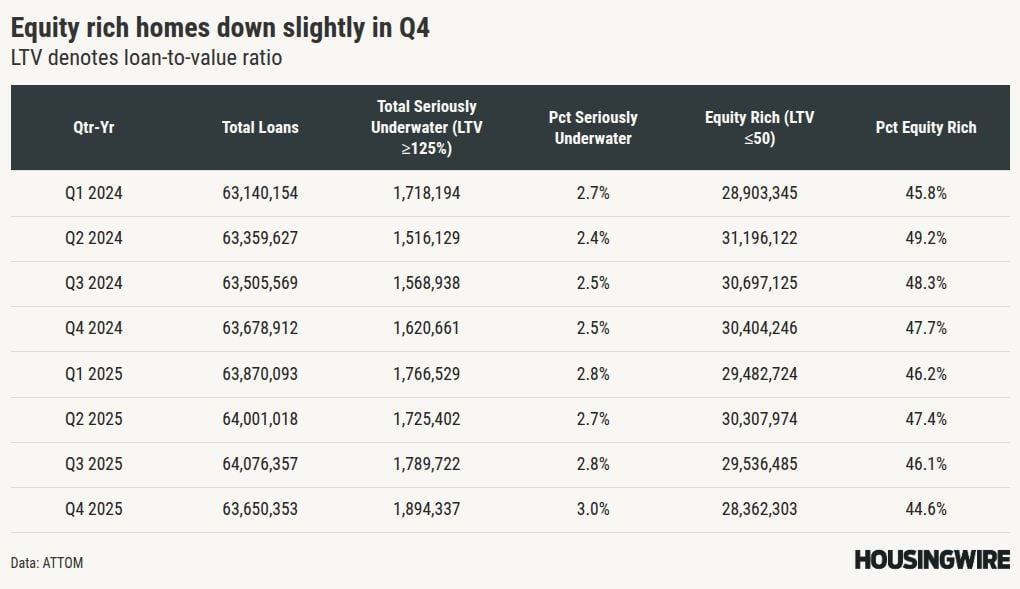 Read MoreA new ATTOM analysis released Tuesday shows that U.S. homeowners ended 2025 with slightly less equity than earli...